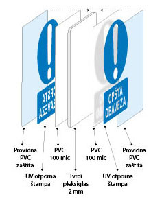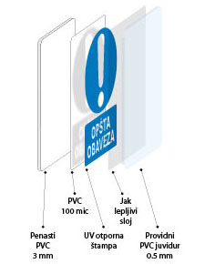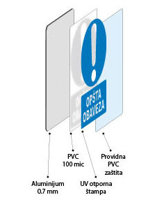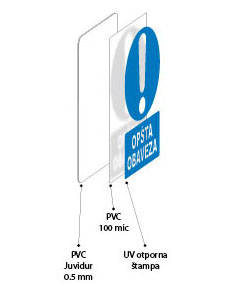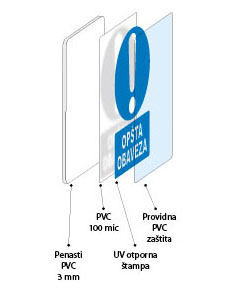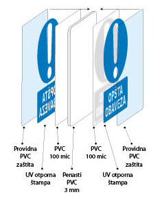 | Znak na 3 mm laganom tvrdom PVC materijalu, laminiran providnom PVC folijom koja dodatno štiti od mehaničkih i hemijskih uticaja. Štampa je otporna na spoljne atmosferske uslove i ne bledi na suncu. Po želji možemo izbušiti rupe za montažu. Ovakvi znaci su lagani i pogodni su za postavljanje na razne vrste podloga, a mogu se postaviti i na stubove ili konzolno. Zbog svoje trajnosti i izdržljivosti mogu se više puta skidati i ponovo postavljati. |