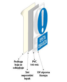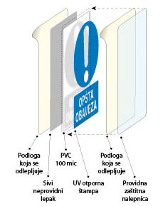 | Samolepljivi znaci sa dodatnom zaštitom od mehaničkih uticaja. PVC nalepnica sa sivim neprovidnim lepkom. UV otporna (ne bledi na suncu). Dodatna providna PVC zaštitna nalepnica je za oko 5 mm veća od znaka. Isporučujemo je posebno i nju korisnik sam postavlja preko znaka. Nisu predviđeni za lepljenje na drvo, karton i druge porozne površine. Kada se postavi, zaštitna PVC nalepnica dodatno štiti od mehaničkih uticaja ili hemijskih agensa. |